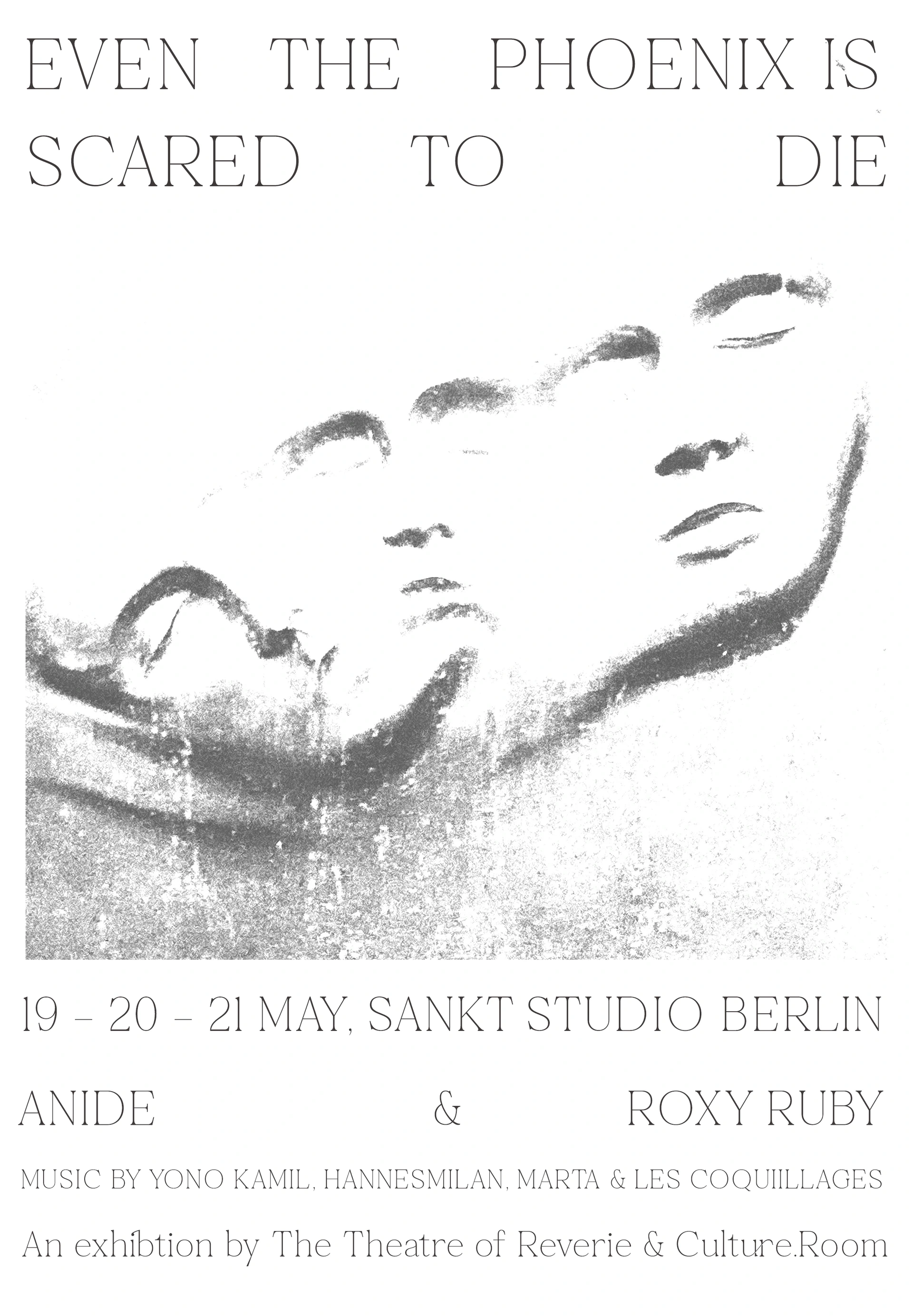 The Theatre of Reverie is pleased to share its next chapter, «Even the Phoenix is Scared to Die», presented by CULTURE ROOM at Sankt Studio from 19 - 21 May 2023. An exhibition of paintings by ANIDE, drawings by Roxy Ruby, collaborative scenery by the two artists and the launch of a new Theatre of Reverie zine. «Even the Phoenix is Scared to Die» is a reflective pause, hovering in the moment of metamorphosis between apprehension and ambition. An ode to the necessity for your personal mythology to echo the cycles of nature to grow. The vine climbing the urn. The Theatre of Reverie is a multidisciplinary project engaged with imagination, dreams, memory, storytelling, hallucinations and mythology. The program aims to create intimate and empathetic atmospheres that nurture curiosity and invite the public to explore their personal connection to these themes.nThe theatre was born from the desire to create singular experiences where the arts blend together to create an immersive interlude. Through painting, drawing, music, performance, installation, publication and workshops, each event is a moment where mediums meet. As a result, the public is offered a rich and encompassing content, allowing them to better approach each element but also, the exhibition as a whole.