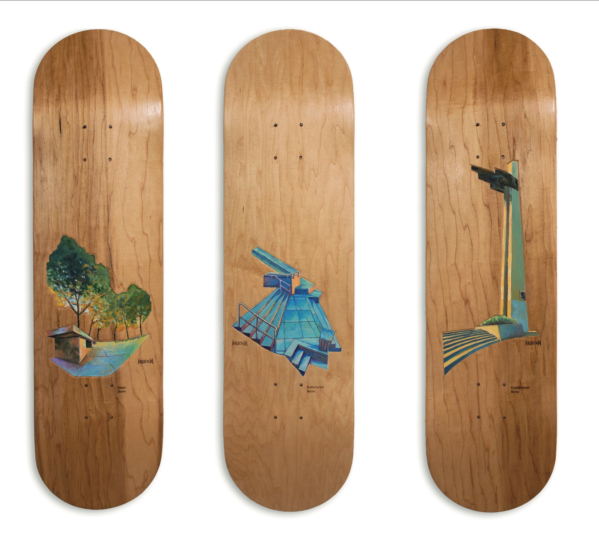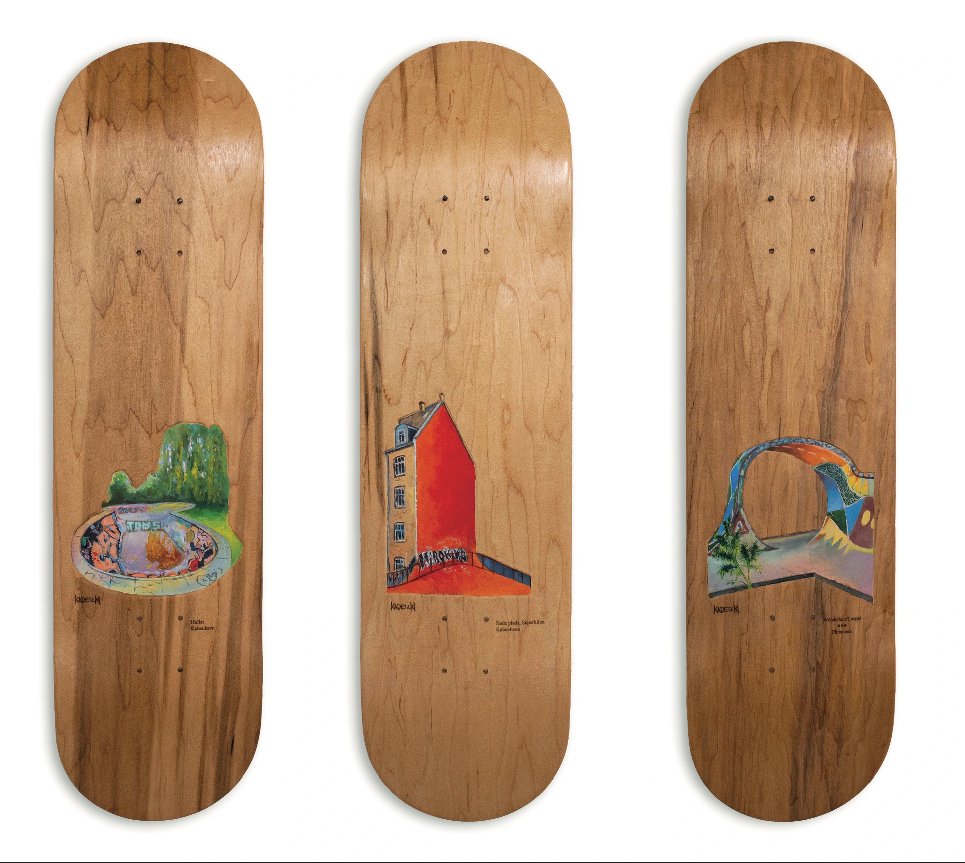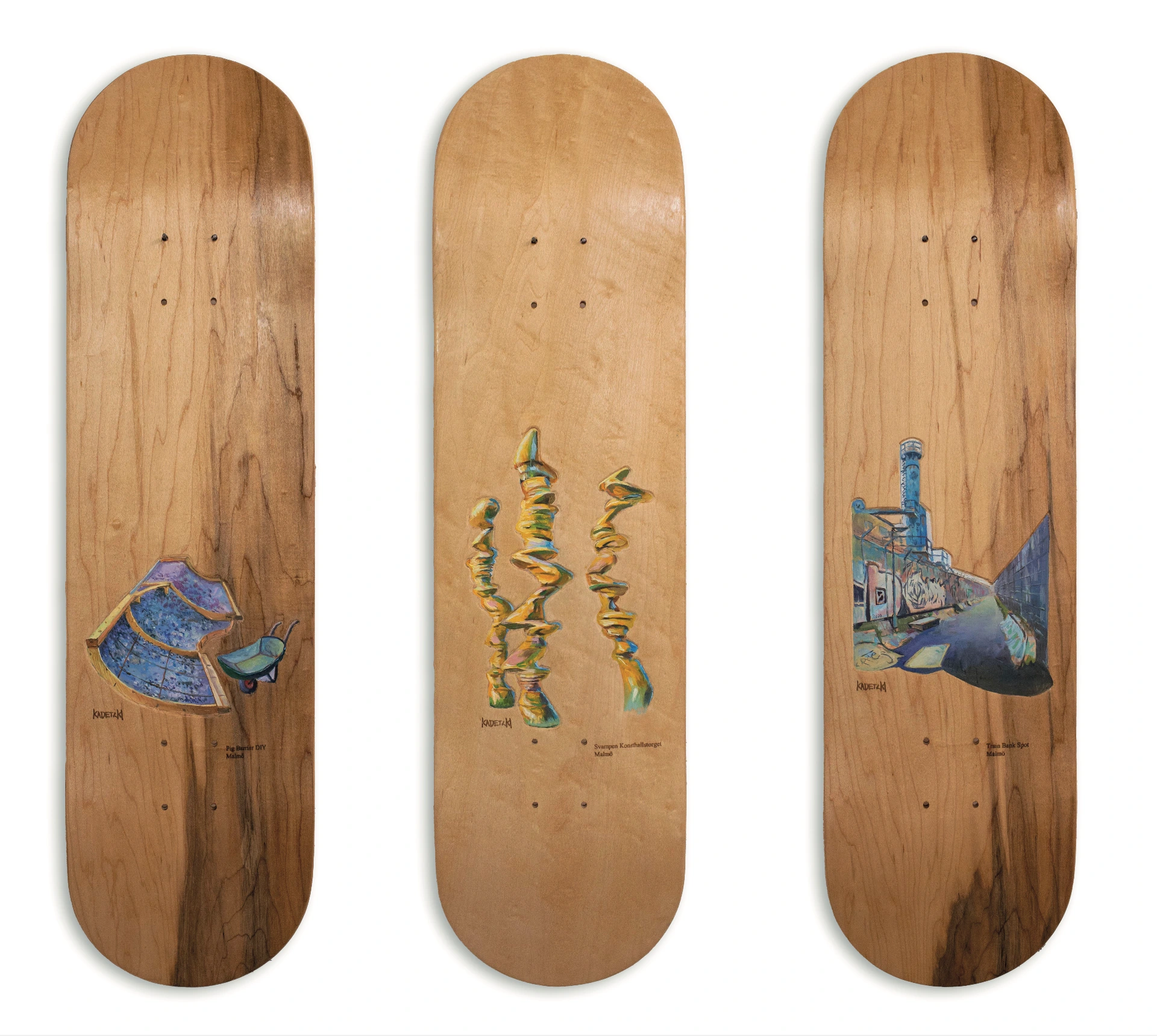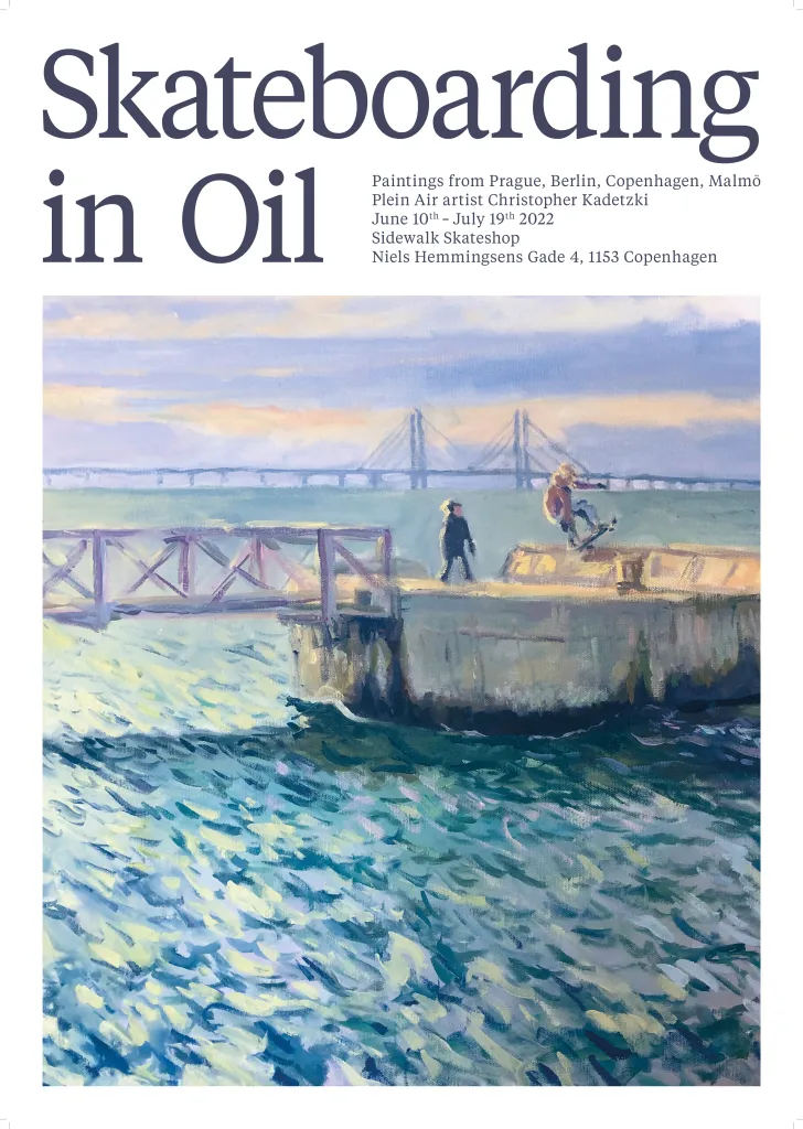 To understand the paintings of Christopher Kadetzki, one needs neither a degree nor a deeper understanding of art. The connection to his work comes from a feeling. I still remember very clearly one of the first meetings with him. On a warm summer night, we sat together by the Spree. Except for the distant laughter of scattered groups of people and the windy, often disjointed silence of the evening atmosphere in Berlin, we heard only the atmospheric jazz music that a mutual friend, immersed in his book, was playing. The yellowish lights of the lanterns danced on the unfathomable black of the water and in the distance an old bridge glowed, bathing the emptiness of the night in a warm atmosphere. Christopher sat in front of his small canvas as always, listening to the music as he skilfully mixed the colours and let the feeling I was carrying that evening flow onto the canvas in sweeping movements. There was hardly any talking that evening. We all felt the same. The vibrating calm of the city at night. The rustling of the wind in the leaves of the big trees. The atmospheric light of the old street lamps. We can still recognise all this in that work today. The feeling still vibrates between the colour nuances of the painted scenery. Christopher is a quiet man who recognises and appreciates nature and peo- ple in all their colourful and emotional variations. But what is really special about his painting is the empathetic dimension of the artworks. There is a feeling in all of his art. It makes no difference which motif he chooses for the next painting. Be it a fallen tree in the autumnal Schlaubetal, the interior of a Berlin nightclub, craftsmen at work or a skate park. His artworks are not about technical perfection or the realistic artistic reproduction of a meticulously selected motif. It is about the depiction of human emotions, experiences and encounters. It is about a feeling. In the course of this artistic process, Christopher manages to authentically document a wide variety of subcultures on the spot, as they happen, in oil. Capturing the conversations, stories and emotions of the people in his work. Skateboarding in Oil deals with the stories and experiences from the skate scene and sheds light on all the people who, apart from any “hype”, have promoted this exciting culture and made it what it is today. Because just like Christopher’s artworks, skating is also about a feeling. Skateboarding in Oil deals with an important year in Christopher Kadetzki’s life. The first trip to Copenhagen, meeting Nicky Guerrero, the Copenhagen Opens 2021 and the many experiences and encounters have had a lasting impact not only on his paintings but also on the artist’s life, his ideas and his possibilities for the future. A special focus that runs like a thread through the artist’s life is on the artisanal aspects of skate culture, which are often forgotten, pushed aside by trends, but are the indispensable foundation of this subculture. Without the almost artistic skills of ramp builders, carpenters and board builders, the culture and the currently ongoing “hype” could not exist. In this sense, the works in the exhibition can also be understood as a tribute to the craft and all the talented personalities who have accompanied the artist over the past year and who, in the background, make the successes of this vibrant subculture possible in the first place. Most works within this publication were created over the last year during the painter’s travels to Europe’s most famous skate spots and in collaboration with a wide range of greats from the skate scene, such as Nicky Guerrero. These include Berlin Banks, Hullet Copenhagen and the Malmö Train Bank spot, which find their appreciation on a handmade and unique series of decks in collaboration with Grzegorz Filewicz, founder of Berlin Boards Brewery.